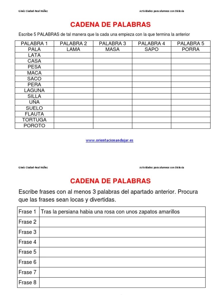 Cadena de palabras a través de sílabas. Dislexia cadena de palabras 1.